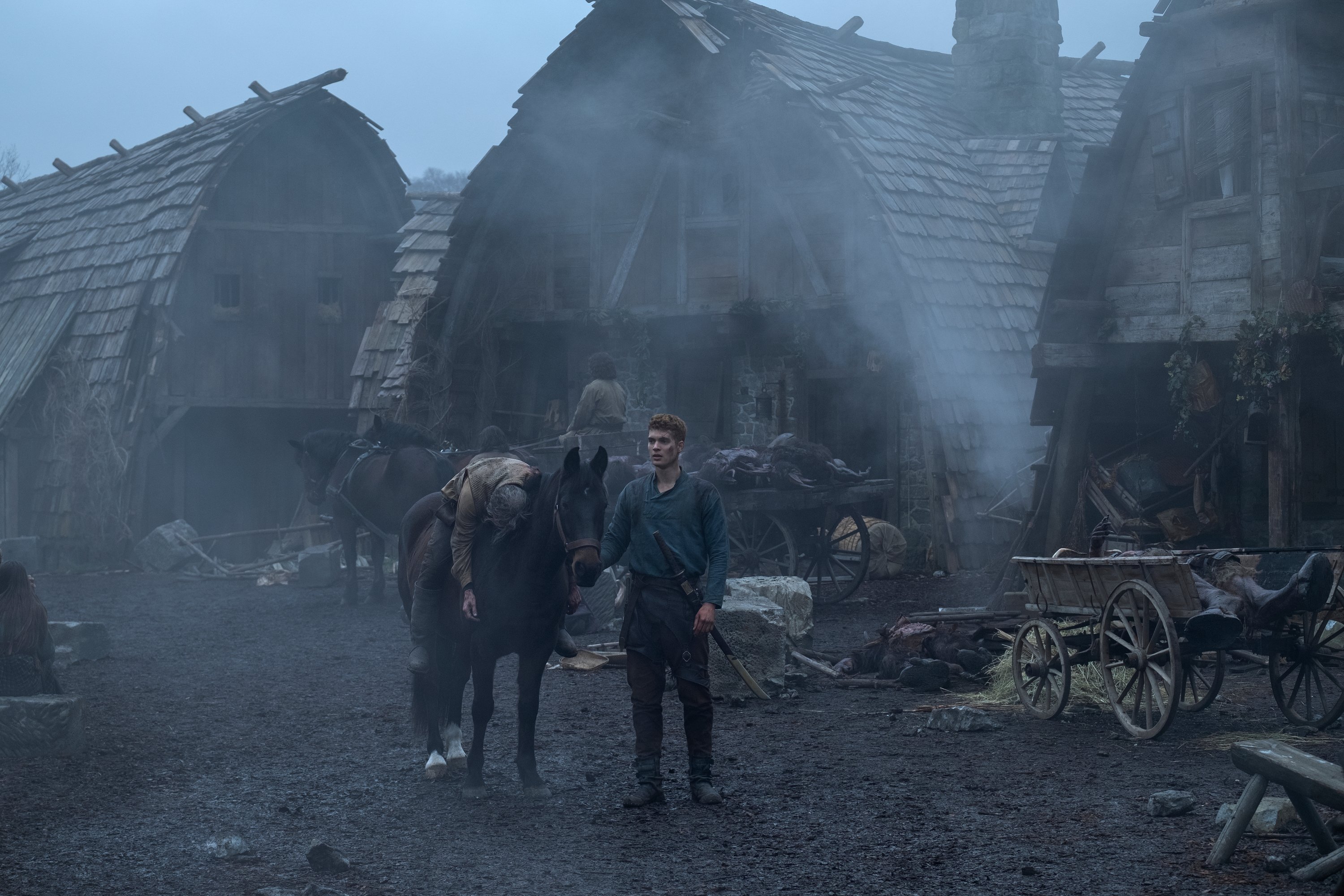 Moiraine and Lan unwind from their travels in a warm bath. The One Power is used again as Moiraine obliges Lan and heats the bathwater. Night surrounds the village and with everyone scattered we see a hooded figure on a horse ride slowly into the village. The figure on horseback is not quite a man, with pale white skin, a large mouth, and no nose or eyes. He certainly has sinister intent.