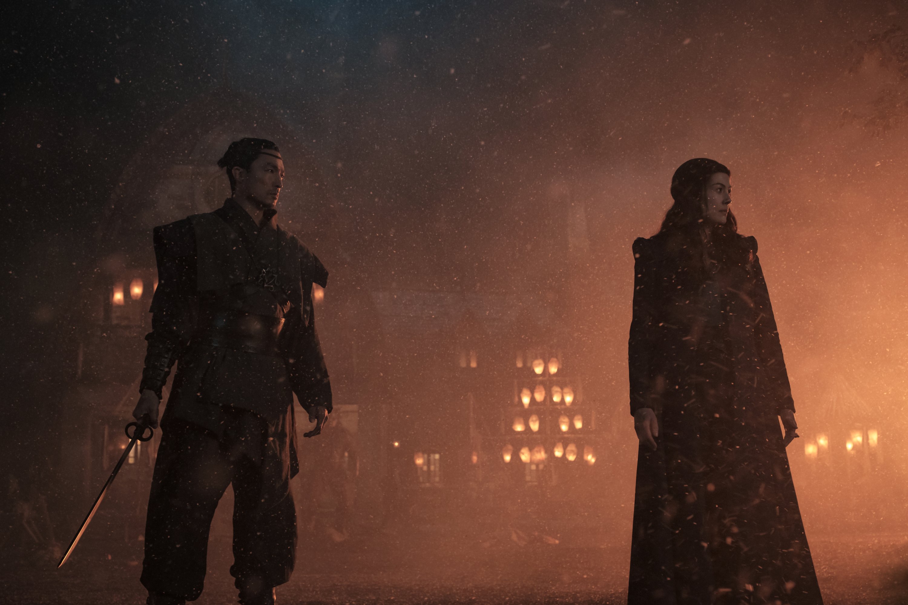 “The world is broken. Many, many, years ago, men who were born with great power believed they could cage darkness itself. The arrogance....” Moiraine Sedai (Rosamund Pike) tells the story of the man who was named Dragon. She shares her resolve to find the boy or girl who has been reborn as the Dragon before the darkness does. The Dragon was a man who caused the Breaking of the World but is meant to save it as they are woven back out into the World. We see Moiraine set out on her journey with Lan (Daniel Henney) at her side.